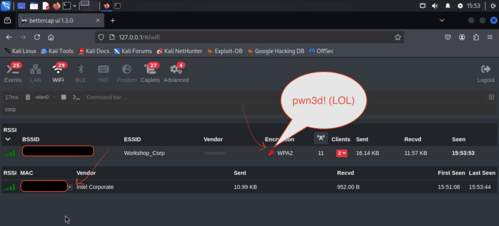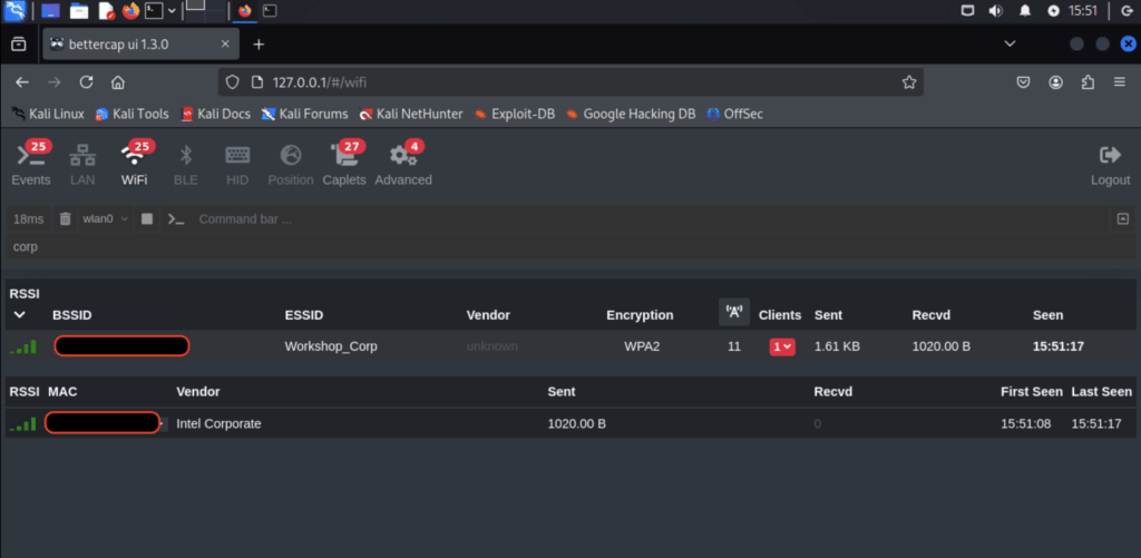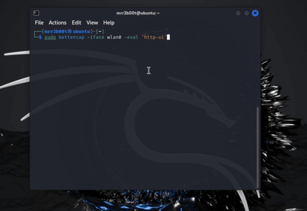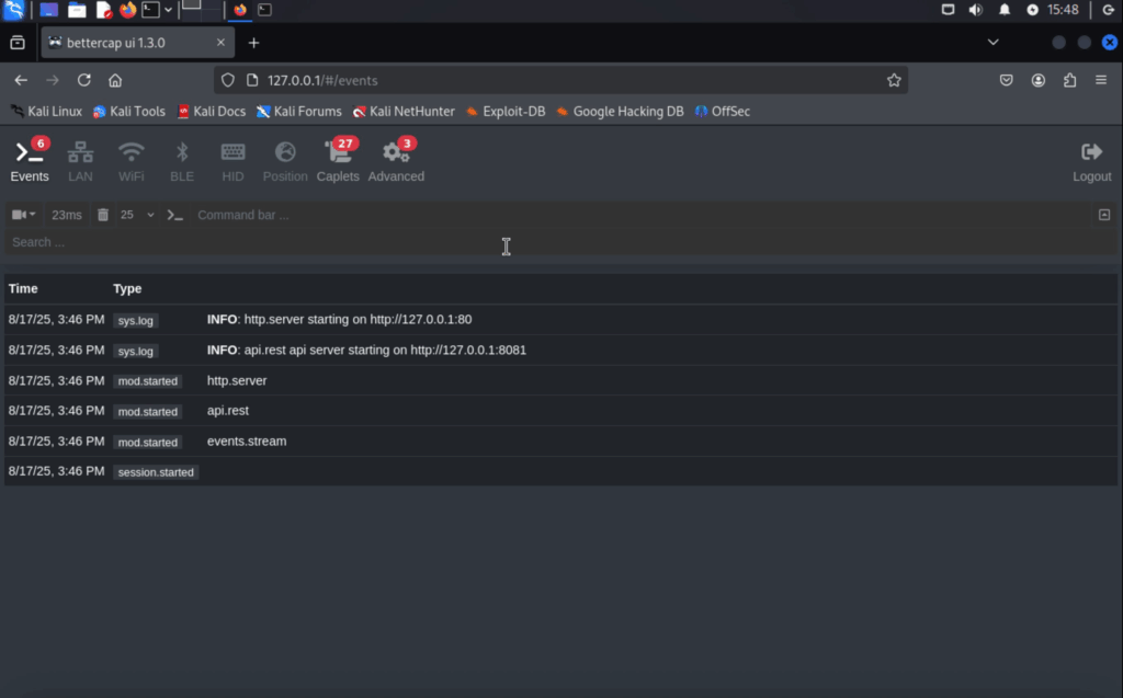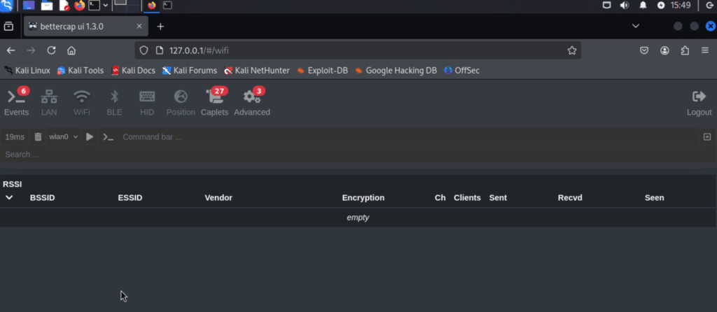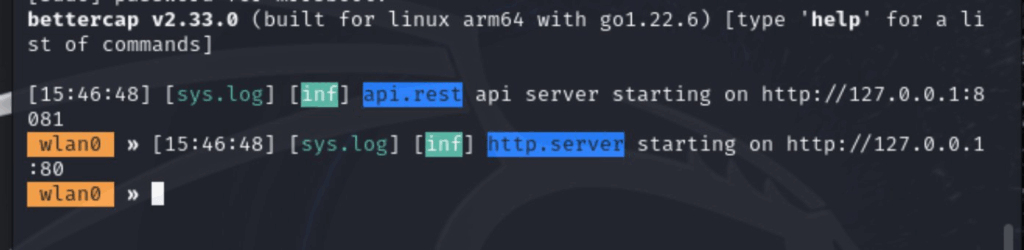 sudo bettercap -iface wlan0 -eval ‘http-ui’ I’m running it on HTTP coz lazy! and it’s only exposed on the loopback interface! so if my vm is compromised I’ve got other problems already ๐Ÿ™‚ (this vm is empty LOL)