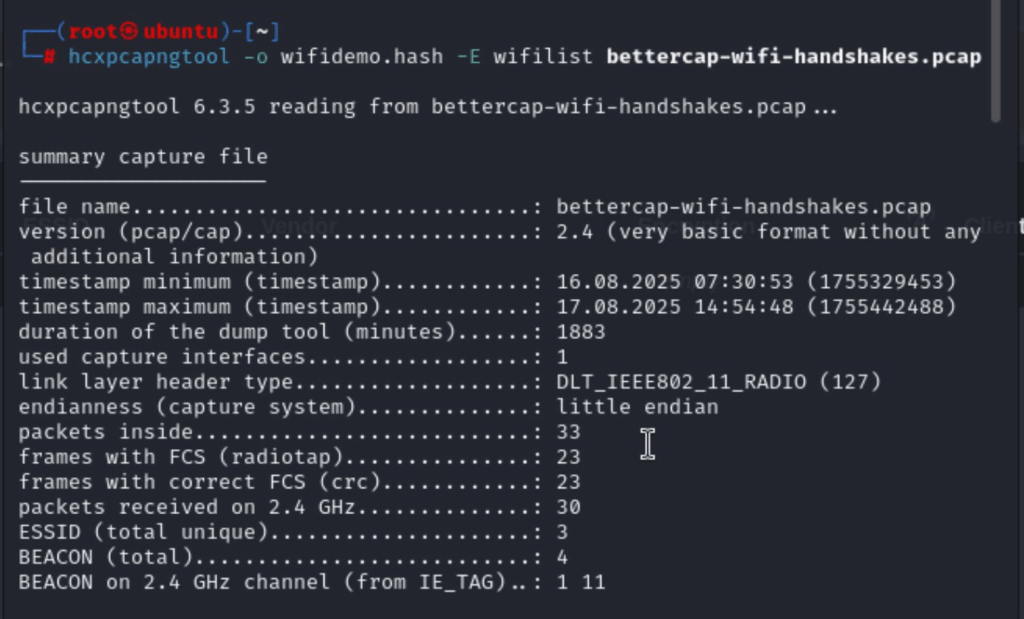 ok we run: hcxpcapngtool -o wifidemo.hash -E wifilist bettercap-wifi-handshakes.pcap this will give us a text file with the SSID (clearly you might have lots of materials in the cap, here we only have one though) and we will get the hash file! wifidemo.hash