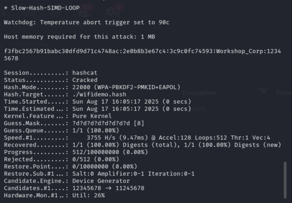 now this part can take seconds, minutes, hours, days… or longer! this is a reality… if you have a strong PSK….. someone is not breaking in! (at least not this way… you can get PSKs other ways ๐Ÿ˜‰ (vodka, gaffer tape and vans etc. ๐Ÿ˜› ) (or infostealers ๐Ÿ˜› ) Hashcat goes brrrrrrrr