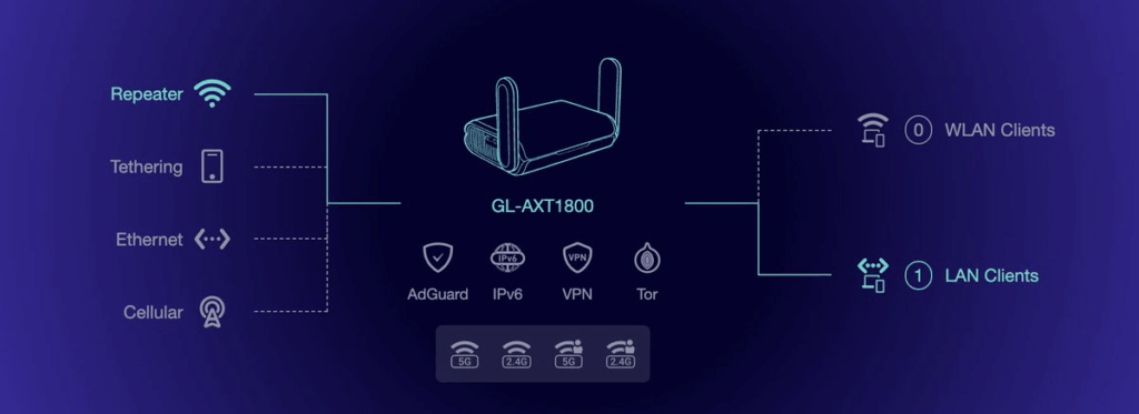 We have a Unifi Express 7! This has an ethernet WAN port. So because we want to have this as a mobile lab, we combine it with a GL-iNet Router via ethernet then we can use that router to get an internet connection (either WIFI repeater, Ethernet, USB 4G Modem)
