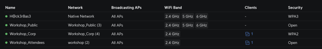 We have a few things setup! Firstly the TP-Link to show how poor their defaults are (on most of their kit I find ITW) You can crack the key space here in 4 minutes on a laptop with not mega GPU One of the WiFi participants managed to capture the key material and then crack the hashes from the TP-link so they won some swag! (A shadow router and a tp link usb WiFi adaptor #ironic) What didnโ€™t work during the workshop was capturing a hash from the WPA2 PSK network on the UniFi gearโ€ฆ. And I donโ€™t know why! So time to investigate!