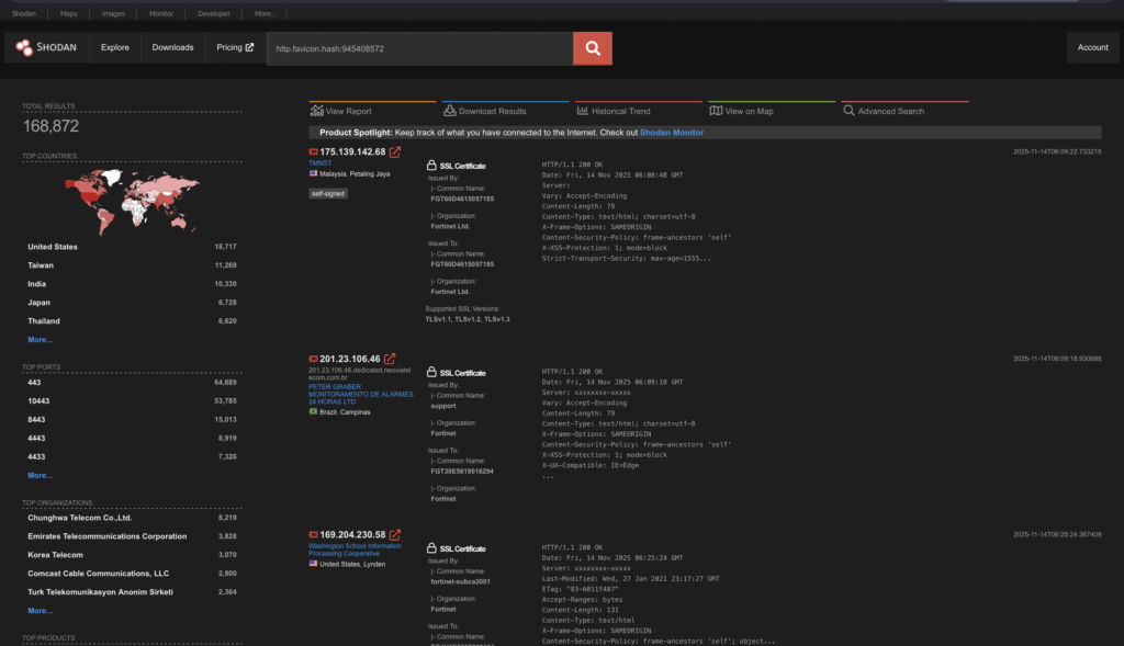 The volume in Shodan for FortiWeb looks relatively low. Especially when compared to Fortigate (I’ve picked a favicon hash, there may be more obviously):