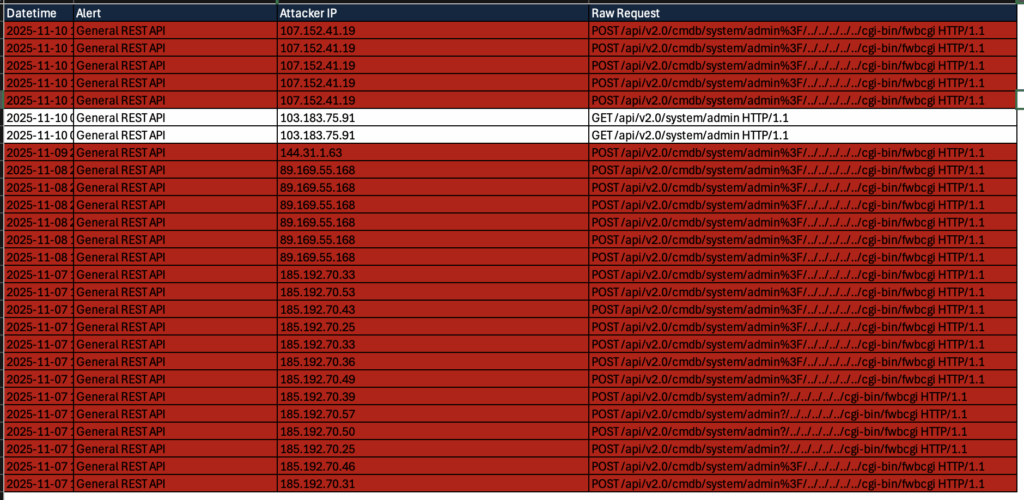 This payload appears to create a local ‘admin’ level user account on the target device. I’ve not got a Fortinet firewall running so I’ve not been able to confirm the effect works myself. This is however looking like enough to the point, I believe the vendor has been notified and it looks ‘exploity’ enough for me to even consider writing about this, 0day or not this is being sprayed, we can see this in logs. The key thing as always is to not panic, if you have a Fortinet with an exposed management interface (WHY?) then I would suggest taking some time to go and investigate, I’ve written some general high level steps here: